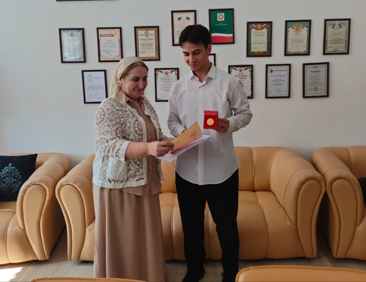 Директор Батукаева Л. М. вручает золотую медаль выпускнику 11 класса Садаеву Р. С.