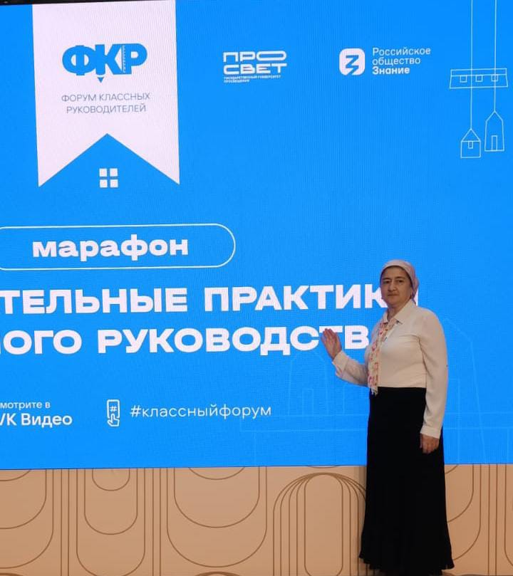 На данном форуме нашу школу представляет Мадагова Зула Шамсолтовна, учитель русского языка и литературы. На площадке форума обсуждаются вопросы взаимоотношений в педагогическом коллективе, безопасности участников образовательного процесса, воспитательной работы, инструментов и подходов к профориентации. Мероприятие организует Минпросвещения России по поручению Президента Российской Федерации Владимира Путина. Стратегический партнер ФКР – АНО «Диалог Регионы».
